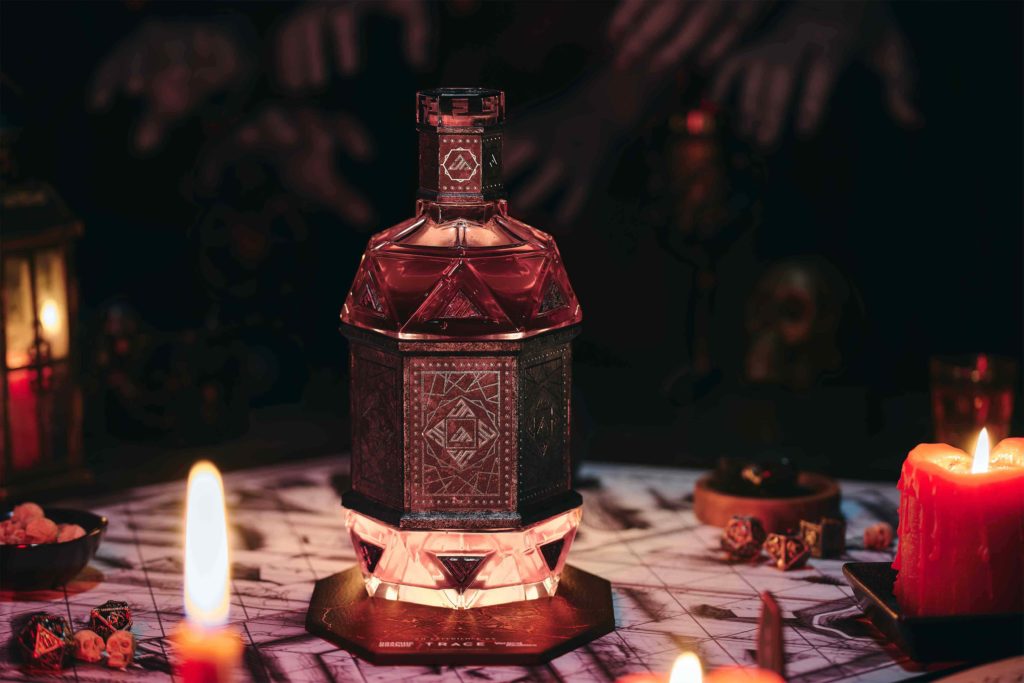 - The Bottle: The glass body is a 20-sided geometric structure, a direct nod to the iconic D20 dice used in role-playing games like Dungeons and Dragons. It features embossed latticework and a central brand mark with a blend of neo-traditional typography.